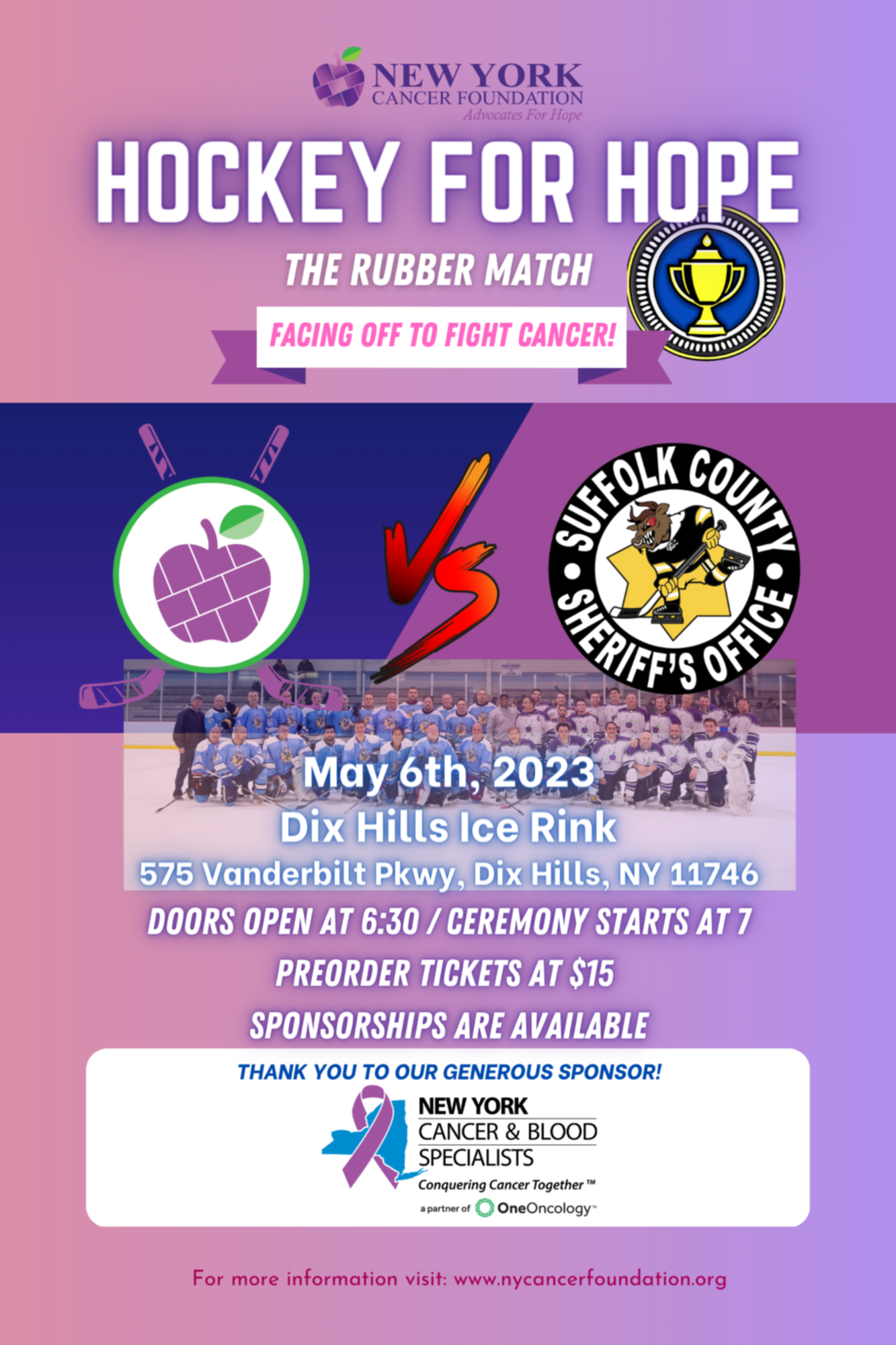 We are so excited for our Hockey for Hope Event on May 6th, 2023. The New York Cancer Foundation will be facing off against Suffolk County Sheriff's Office, Suffolk's Boldest Hockey. Please join both teams as we face off to fight cancer! This will be the ultimate Rubber Match! All proceeds will benefit the New York Cancer Foundation in our mission to assist cancer patients with their household bills.